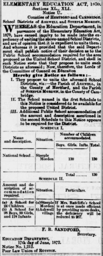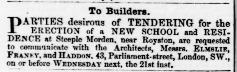 Reverend William Martin, M.A. became Vicar of Steeple Morden in 1865 and appears to have been a campaigner. One of his first causes was championing the establishment of a village school. He sought help from the Earl of Hardwicke, who agreed to sell two roods (half an acre) of land for £20, in the centre of the village, close to the Church. He also donated financially and New College, Oxford, Patrons of the Living, did likewise and Martin topped it all off with a grant from the Government. A parish committee of subscribers, including several of the leading farmers ensured further financial support. Martin did not dawdle and by March 1866 tenders were invited from builders to erect a new School and Schoolhouse. Purchase of the site was not completed until August 1866 and the acquirers were the Vicar and Churchwardens of Steeple Morden as Trustees. Extracts from the Conveyance and Trust Deed dated 7 August 1866 are below.