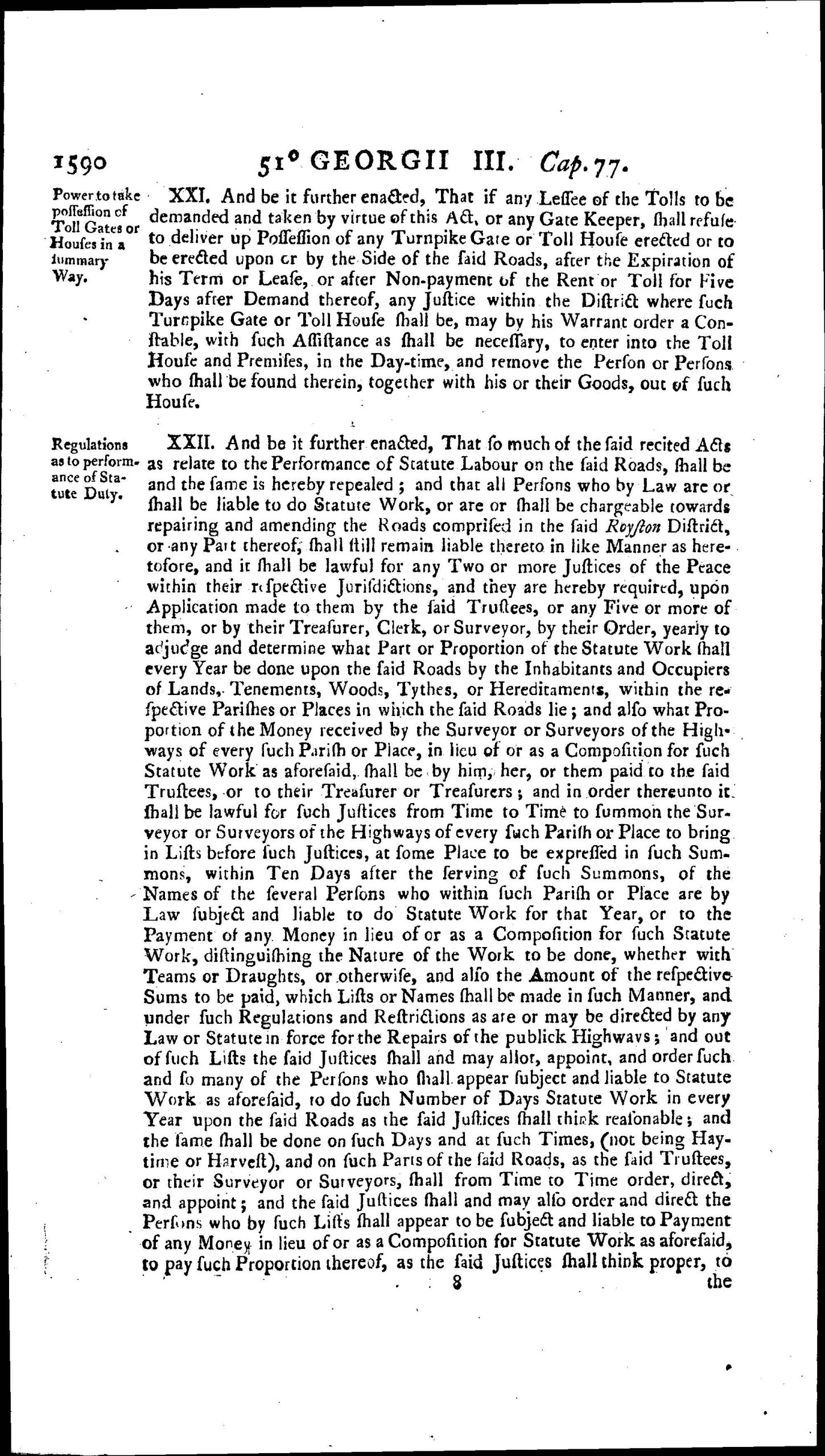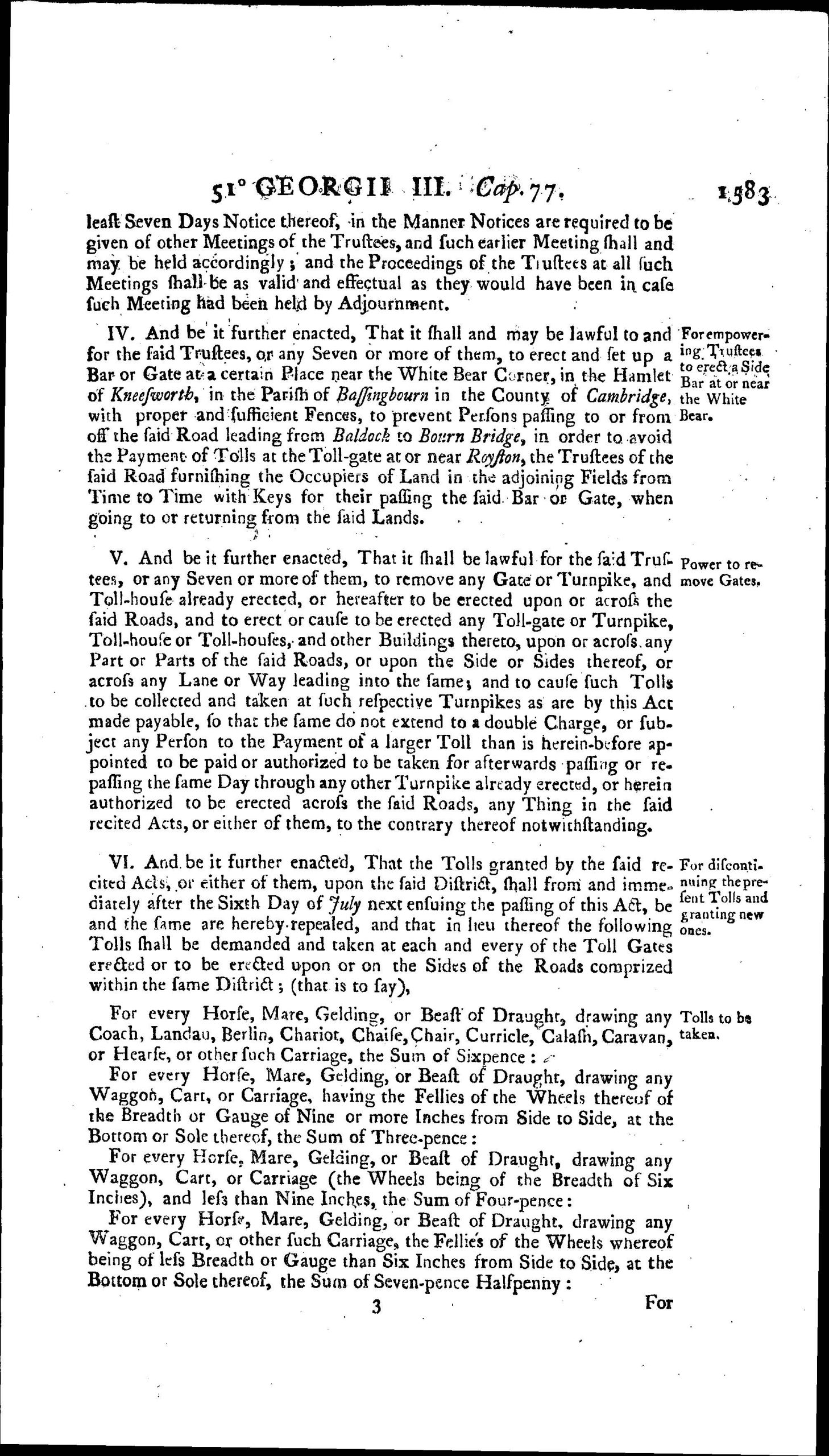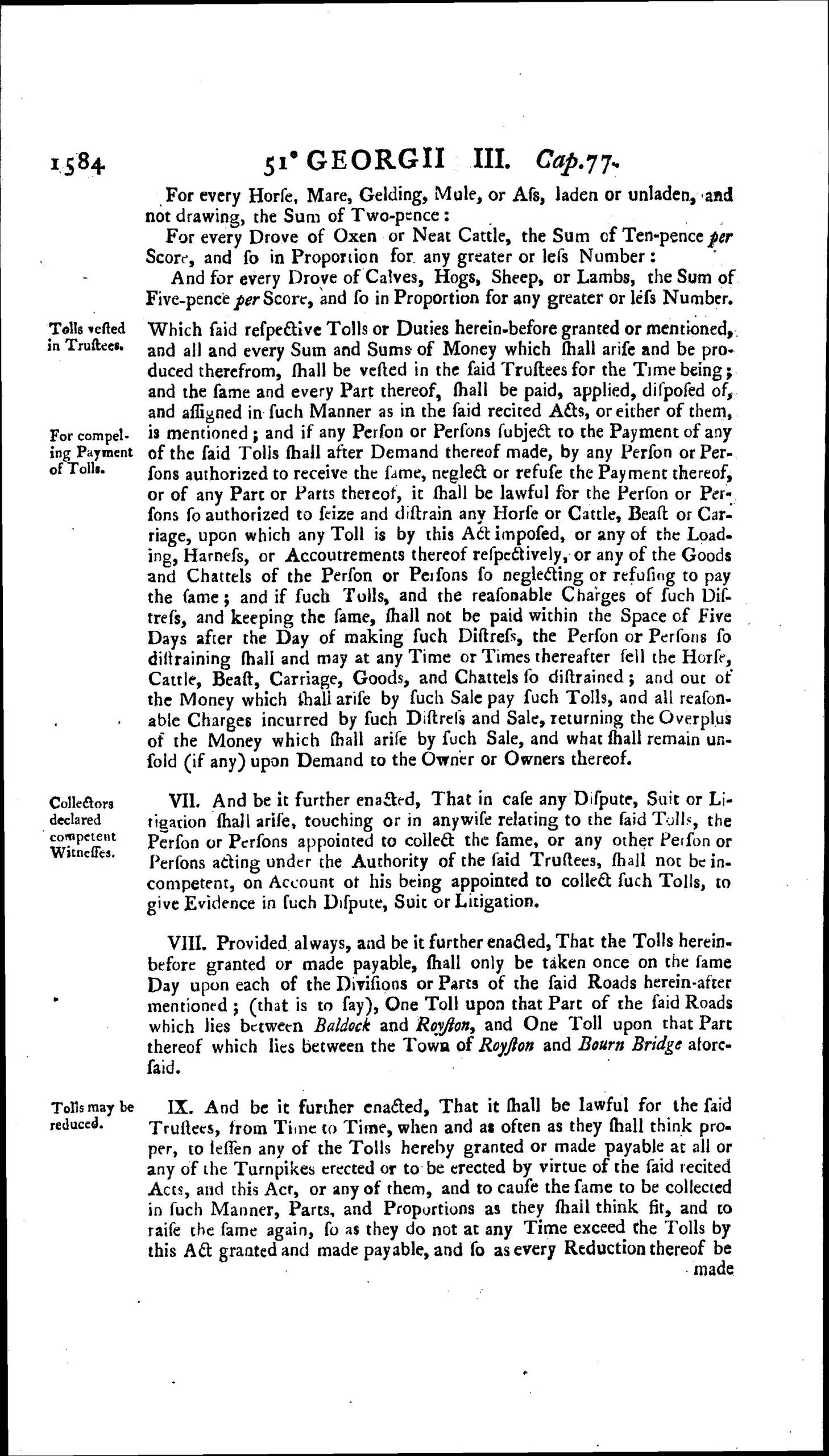 In 1790 it was decided that the Tring to Baldock stretch was not economic and this was returned to parish responsibility, leaving the Baldock, Royston and Bourn Bridge section to continue operating. A continuation Act “Baldock, Royston and Bourn Bridge Act (51 Geo. 3 c. 77) was passed 1811. There was a further similar Act in 1833 3 & 4 Wm IV . c. lx.