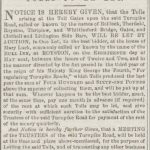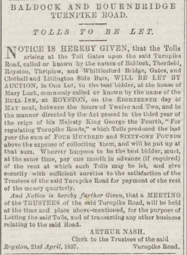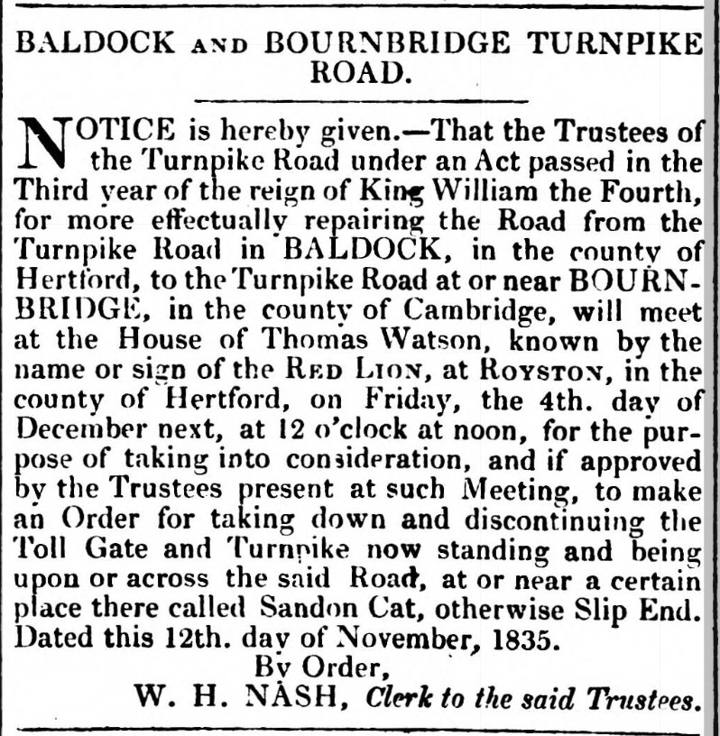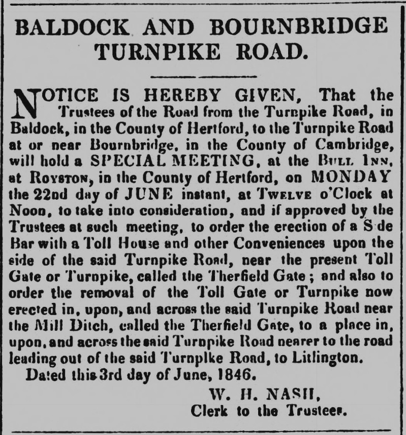 From newspaper reports and advertisements the following gates and bars are mentioned in the years noted below. Gates were being moved and new ones erected in the period 1830 to 1860? There were toll bars on the Clothall road (1811, 1839, 1840). Litlington road (1857, 1866, 1869, 1870). Sandon Cat or Slip End Gate (1835, 1846). Therfield Gate (1846, 1857).