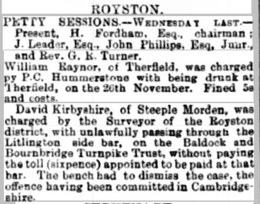 As the earliest mention found is 1851, one wonders if the Steeple Morden Toll bar was erected after the railway was opened in 1850 to catch traffic heading to and from the new station, leaving and joining the Turnpike?